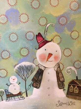 Что изображено на живописной картине: Снеговик в шубе - на улице же зима, маленький задорный снеговичок на санках и домик с печкой, где пекут пироги